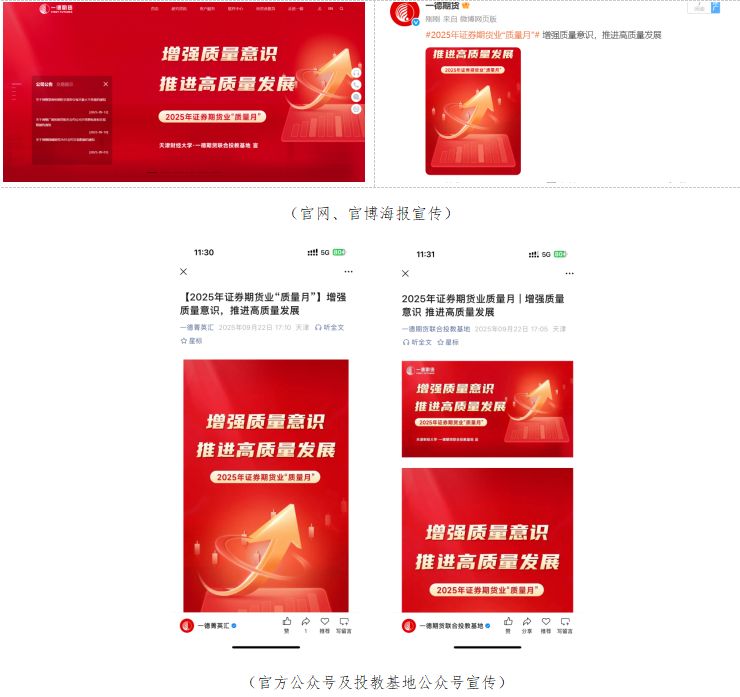 为深入贯彻落实国家关于“增强质量意识 推进高质量发展”的战略部署,积极响应天津证监局2025年全国“质量月”活动号召,一德期货有限公司(以下简称“一德期货”)及天津财经大学·一德期货联合投资者教育基地(以下简称“一德期货投教基地”)紧扣证券期货业标准化建设主线,以“强标准、优服务、促共识”为目标,于2025年9月开展系列主题活动,现将活动开展情况总结如下: